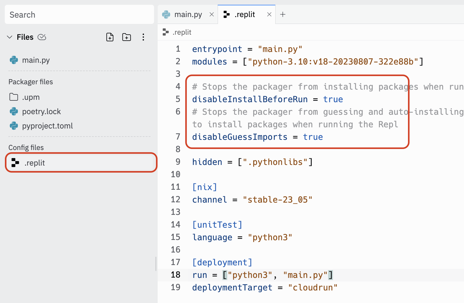 # Stops the packager from guessing and auto-installing packages, but it still runs to install packages when running the Repl